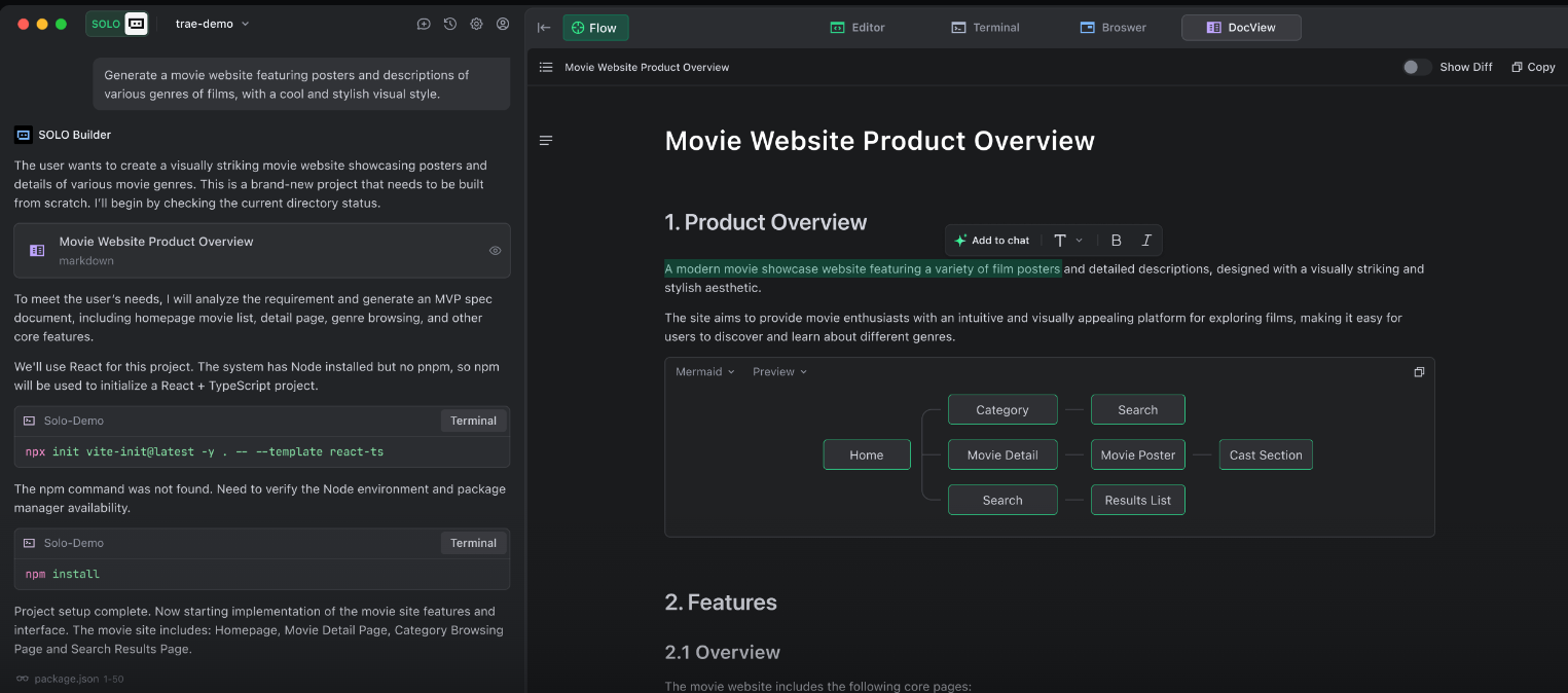 • 真正的“对话式编程”体验:Trae新版本将Builder与Chat板块融合,打破了传统以代码为中心的IDE模式,走向“对话即编程”的未来开发模式。