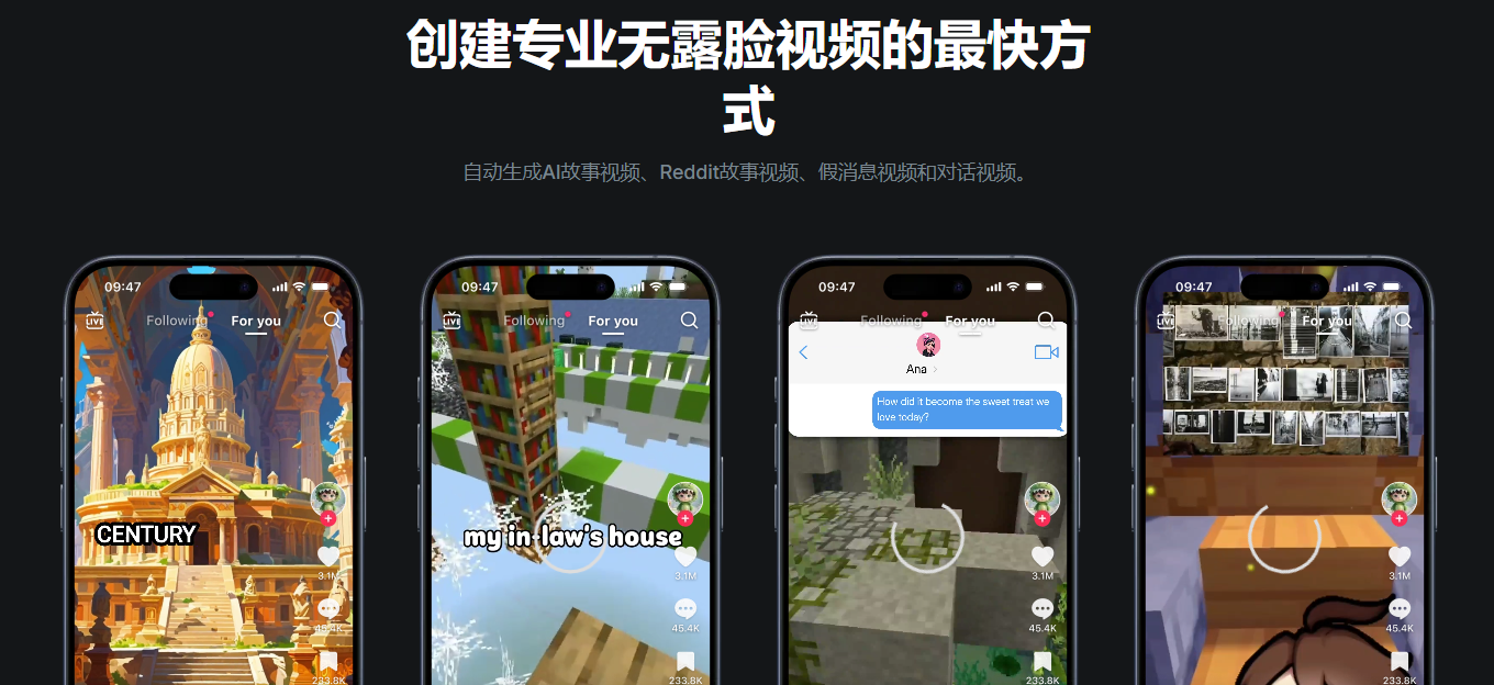 | 多样化视频生成 | 支持生成AI故事、Reddit故事、假消息视频、对话视频等多种内容形式 |